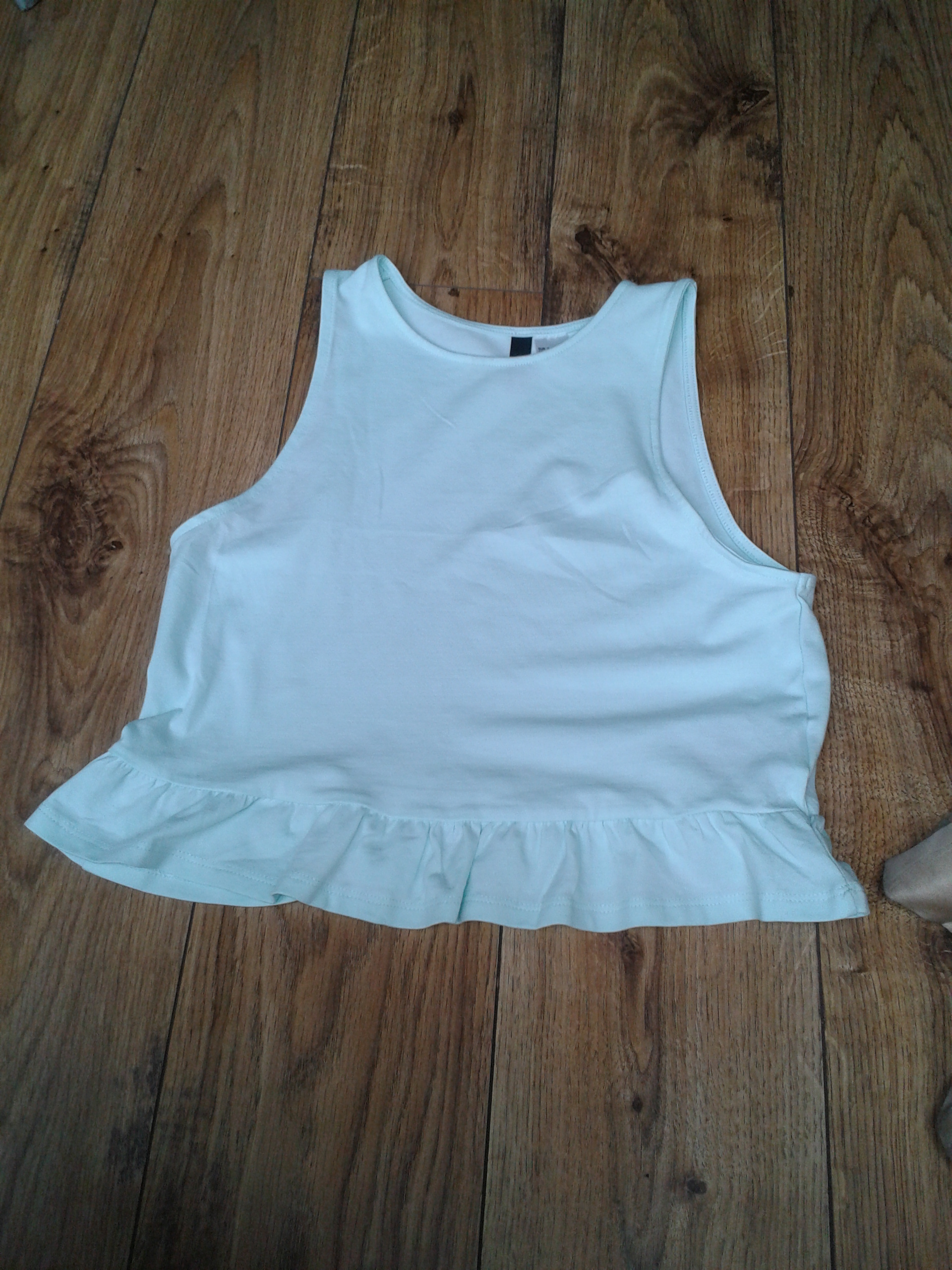 When I went to H&M, I bought clothes which were on sale.Firstly, I picked a black and white patterned short shirt which went down to £2. Then, I picked a light green crop top. The price is £6.00 I think.On camera, the crop top looks light blue.