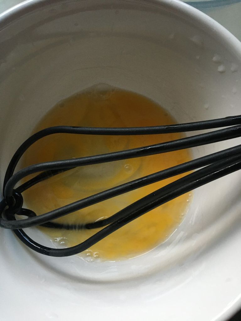 Poured the soy milk from the small glass bowl into the white bowl and mixed the egg and soy milk.