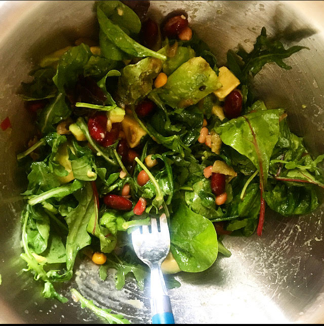 Added salad leaves, 1 whole avocado, half a can of beans salad mix, honey and lemon.
