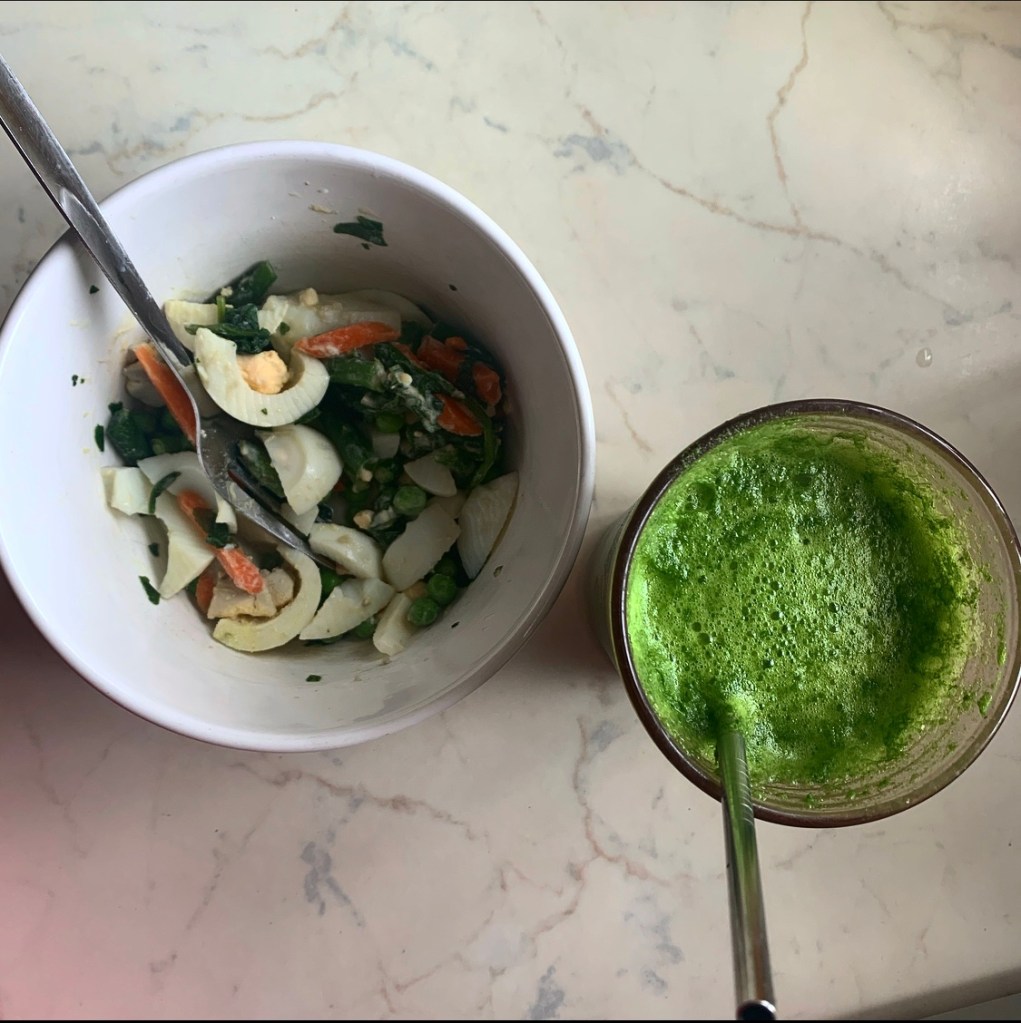 Breakfast: egg and vegetable salad with spinach juice